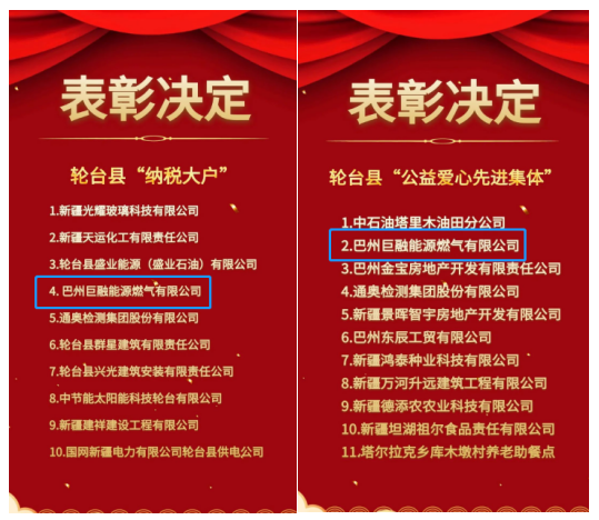 巴州巨融能源作為輪臺(tái)縣先進(jìn)單位,全年守法經(jīng)營(yíng)、安全合規(guī)、創(chuàng)業(yè)創(chuàng)新、回報(bào)社會(huì)。2022年度參與助民工程、解決當(dāng)?shù)剞r(nóng)副產(chǎn)品滯銷等公益活動(dòng)累計(jì)捐贈(zèng)超過(guò)10萬(wàn)元,榮獲2022年度輪臺(tái)縣“納稅大戶”及“公益愛(ài)心先進(jìn)集體”榮譽(yù)稱號(hào)。
